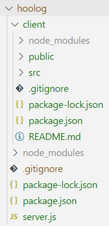 일단, 나의 프로젝트 폴더 구조는 다음과 같다.root 폴더 밑에 client라는 폴더를 만들어서 create-react-app 명령어를 사용하여 react로 돌아가는 프론트를 만들었다.