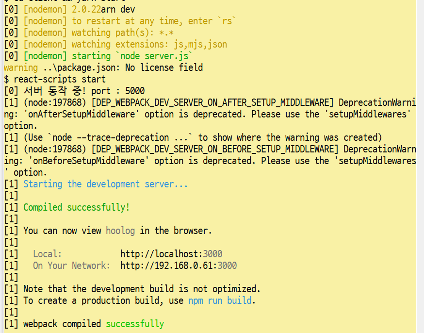잠시 후에 cmd 창에다 yarn dev라는 명령어를 치면 'concurrently --kill-others-on-fail ~~~~' 내용이 실행된다!
