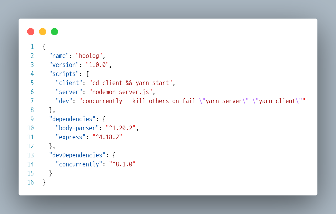 root 폴더 바로 밑의 package.json 파일에 서버 세팅을 해준다.